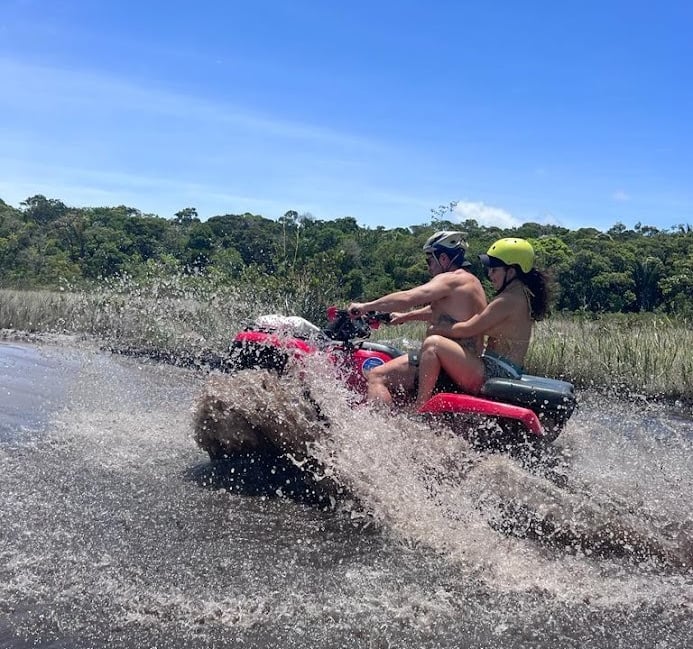 caminhos emocionantes off-road, cenários naturais, com areias brancas, poças d'água e manguezais. Os próprios turistas têm a oportunidade de conduzir e pausar para tirar fotos. Explore a Quinta Praia do Encanto e Garapuá, uma vista espetacular.